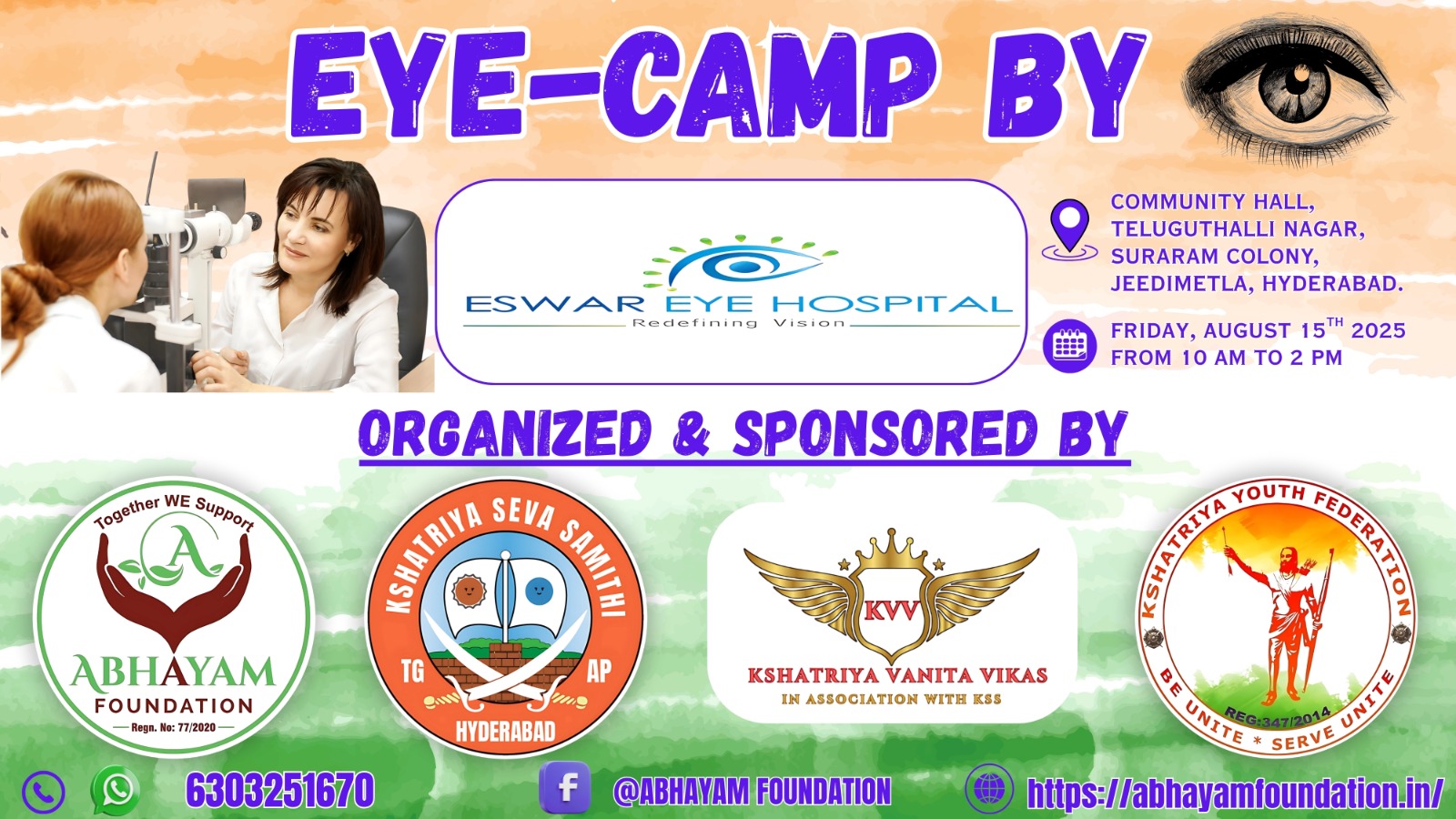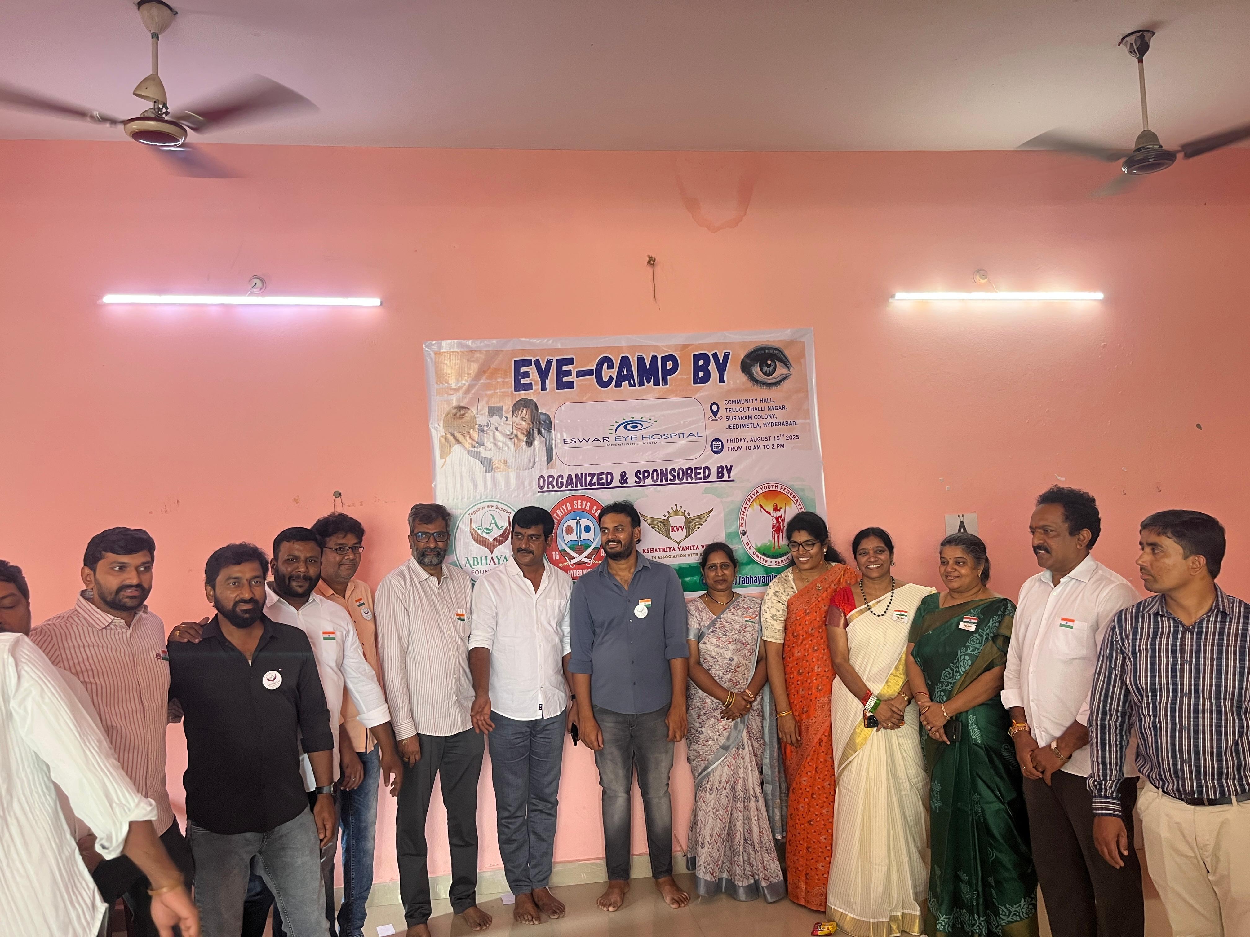 Kshatriya Vanitha Vikas (KVV), in collaboration with Abhayam Foundation, Kshatriya Seva Samiti, and Kshatriya Youth Federation, organized a free eye camp at the Community Hall in Telugu Talli Nagar, Surraram on Independence Day. The event aimed to provide quality eye care services to the community. The eye camp offered comprehensive eye check-ups, medical consultations, and necessary treatments, promoting healthcare and vision for a brighter future. This noble endeavor reflected the spirit of service and patriotism, making a positive impact on the lives of many.